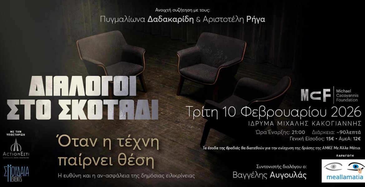 Ο πρώτος Διάλογος στο Σκοτάδι φιλοξενείται στο Ίδρυμα Μιχάλης Κακογιάννης, την Τρίτη 10 Φεβρουαρίου 2026, με θέμα: «Όταν η τέχνη παίρνει θέση: Η ευθύνη και η αν-ασφάλεια της δημόσιας ειλικρίνειας».